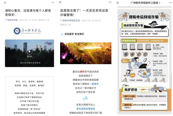学校认真落实校园线上反诈宣传工作,定期通过各级网站、公众号、班级群发布反诈推文、反诈提醒。通过线上反诈宣传,丰富宣传载体,进一步加强师生的范诈骗意识。